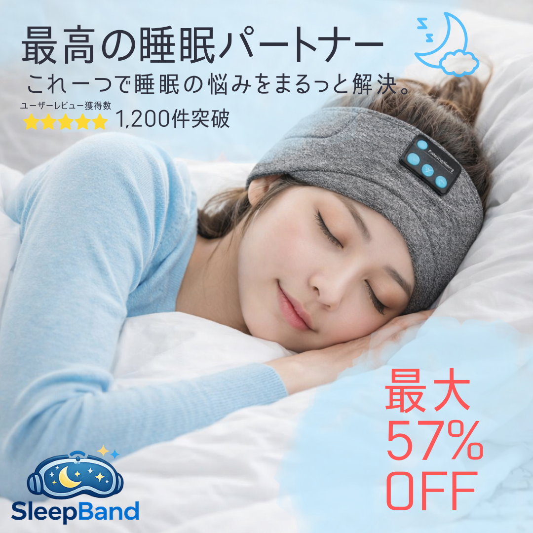 仕事や家事、育児で就寝時間が不規則になり、朝すっきり起きにくいと感じる方へ。Sleepbandは、遮光と音の再生で、就寝前のリラックスできる環境づくりをお手伝いします。